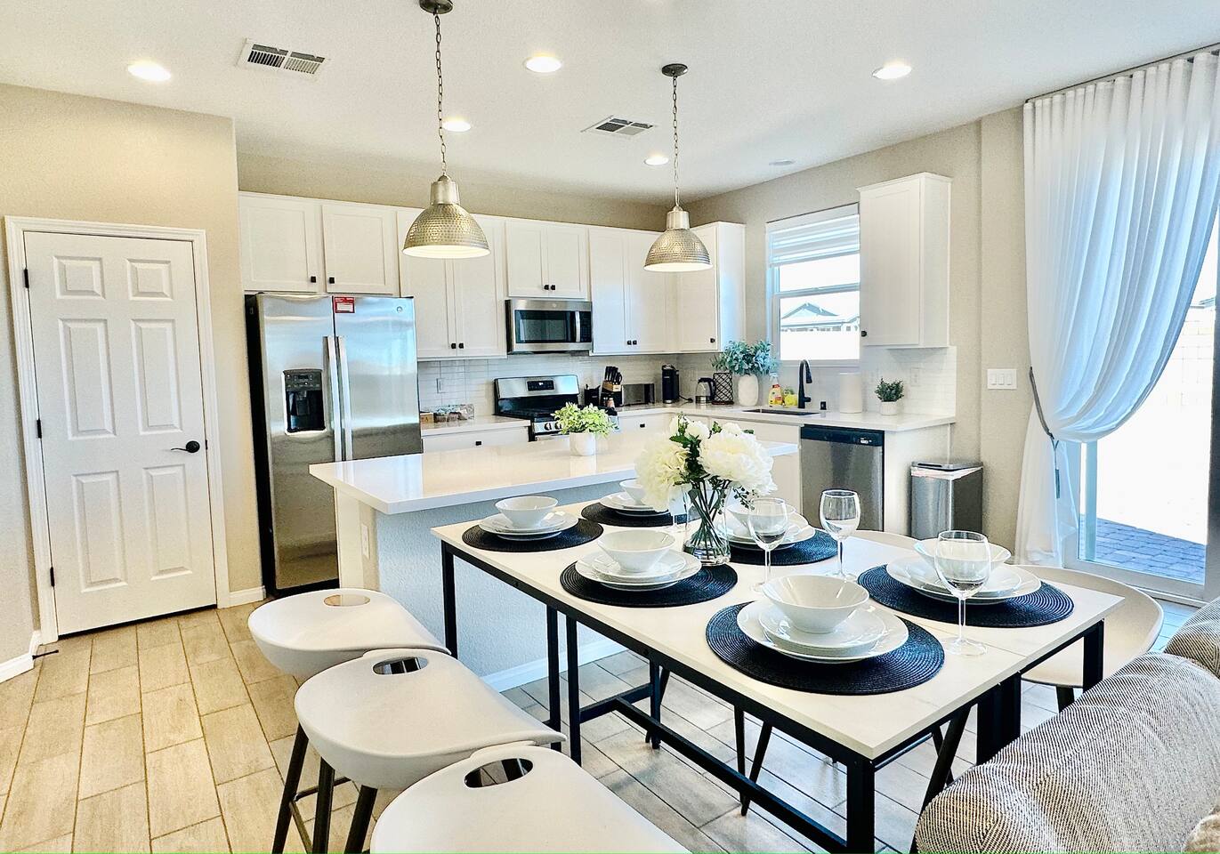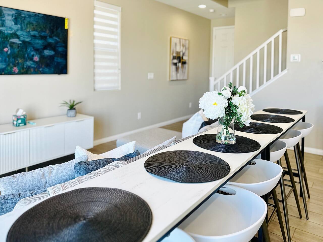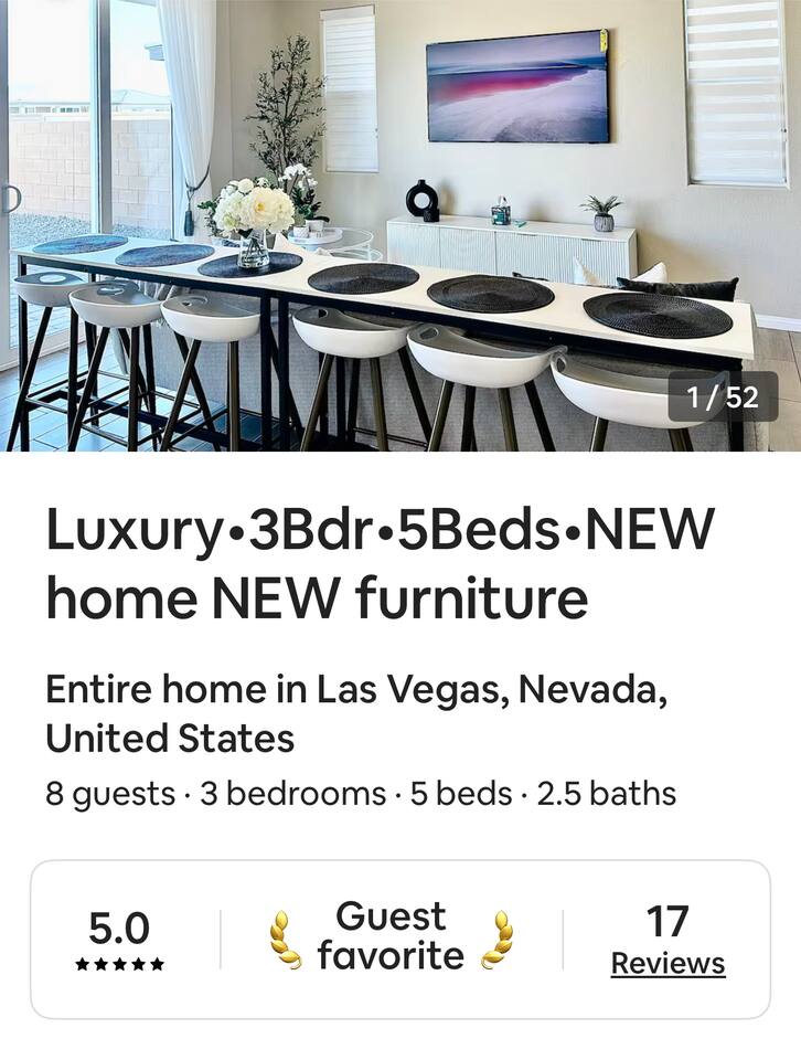 Kick back and relax in this calm, stylish space. ALL NEW furniture. 2024 build new house. Your family will be close to everything when you stay at this centrally-located place. Welcome to your Las Vegas retreat! Close to 15 freeway. this 3 bedroom 5 Beds home offers everything you need for your modern getaway. **Please note that this is a strict NO party house.** The space Traveling as a group doesn’t mean you have to give up luxury. Our chic 3-bedroom total of 5beds , 2.5-bathroom home can comfortably accommodate up to 8 guests. Beautiful décor all New Furniture's. 2024 build home. -King bed x1 -queen bed x1 -Single bed x2 -Sofa bed x1 -Air Mattress (upon request) Modern furnished kitchen and large island with refrigerator w/ filtered water, capsule cup of coffee and tea bag; gas stove, oven, dishwasher and microwave. Full laundry in house (washer and dryer). Living room has a 65 inch smart TV with access to all major streaming apps to watch your favorite show. WiFi is also provided onsite. Master room also have a 65 inch smart TV. Private two car garage. 15 minutes from Las Vegas Strip Local stores and restaurants are 2-5 mins away. Enjoy a stylish experience at this centrally-located place. ALL NEW furniture. Your family will be close to everything when you stay at this centrally-located place. Welcome to your Las Vegas retreat! 15 min to strip. this chic 3 bedroom 5 Beds home offers everything you need for your modern getaway. **Please note that this is a strict NO party house.** The space Traveling as a group doesn’t mean you have to give up luxury. Our chic 3-bedroom total of 5beds , 2.5 bathroom home can comfortably accommodate up to 7 guests. Beautiful décor all New Furniture's. 2024 build home. -Bedroom 1-King bed x1 -Bedroom 2-Queen bed x1 -Bedroom 3-Single bed x2 -Loft sofa bed X1 Modern furnished kitchen and large island with refrigerator w/ filtered water, capsule cup of coffee and tea bag; gas stove, oven, dishwasher and microwave. Full laundry in house (washer and dryer). Living room has a 65 inch smart TV , master bedroom has a 65 inch TV with access to all major streaming apps to watch your favorite show. WiFi is also provided onsite. Private two car garage. 15 minutes from Las Vegas Strip Local stores and restaurants are 2-5 mins away. CASINOS: Hard Rock(9.3 miles) Resorts World(10 miles) Caesar’s palace(9 miles) MGM Grand(8 miles) New York-New York(8.5 miles) Wynn(10 miles) Bellagio(9 miles) GOLF: DragonRidge Country Club(16 miles) Desert Willow Golf Course(8 miles) Chimera Golf Club(18 miles) Rio Secco Golf Club(8 miles) The revere golf club(10 miles) Cascata Golf Club(25 miles) Reflection Bay Golf Club(25 miles) SHOPPING: Las Vegas Premium Outlets South(4 miles) Fashion Show Mall(10 miles) The Forum Shops(9 miles) Miracle Mile Shops(9 miles) The Grand Canal Shoppes(10 miles) Town Square(6 miles) ATTRACTIONS: Red Rock Canyon(18 miles) Shark Reef Aquarium(8 miles) The Big Apple Coaster & Arcade(9 miles) High Roller(10 miles) Convention Center(8 miles) Madame Tussauds Las Vegas(10 miles) Fremont Street Experience(15 miles) The Colosseum(10 miles) Airport: Harry Reid International Airport(9 miles) *New community may have construction noise outside the house during the day. Guest access Whole house will be available Other things to note Self check-in with smart lock If you want early check-in or late check-out, please feel free to reach out 48 hours prior to your arrival date. Availability is dependent on prior or next guests. Unapproved late check-out is subject to $75 service charge. Any type of Smoking or vaping inside/outside the property is strictly prohibited. Any residual substance from smoking or vaping inside /outside the house will be subject to a fine or $450 to cover the additional cleaning costs. SECURITY CAMERAS ON SITE: *There is a video camera in the front door; on top of garage and backyard. Ring Door Bell camera in front entrance. Camera always recording for security reasons. We do have access to the videos in case there are discrepancies with number of guests, pets, etc. The community has strict noise ordinances. Please observe the quiet hours to respect the neighbors, quiet hour rules from 10pm to 7am. We DO NOT allow parties or any unauthorized guest. No visitors . If you ignore the local laws, house rules, or violate Airbnb policy, we will cancel the remainder of your stay and you will be asked to leave immediately without a refund. Any fines due to violation of local noise ordinances will be the responsibility of the guest. Missing or damaged items - Any evidence of willful or negligent loss or damage to the property, furnishings, decoration, landscaping, towels, linens or other items will be charged at direct replacement cost plus a fine of up to $200. Towels and linens - Guests are required to keep towels and linens in good condition. Towels and washcloths should not be used to remove makeup or for cleaning purposes. Any permanent stains on towels or linens will fall into the category of negligent damage. Each damaged towel will be charged $50, damage linens will be charged $100 Guests should NOT wash comforters or duvet comforters themselves as this can cause damage to those items and the washing machine. House Rules - Any evidence of a guest breaking posted house rules, including exceeding the occupancy listed by the guest on the reservation, parking restrictions, illegal substances or use of the property can result in a fine of up to $1000.00 and / or eviction from the property. This property is professionally cleaned and fully sanitized serviced for every guest who books with Us! The home will always be stocked with bath towels, body wash, shampoo, and conditioner. If you need anything additional during your stay, please feel free to reach out!